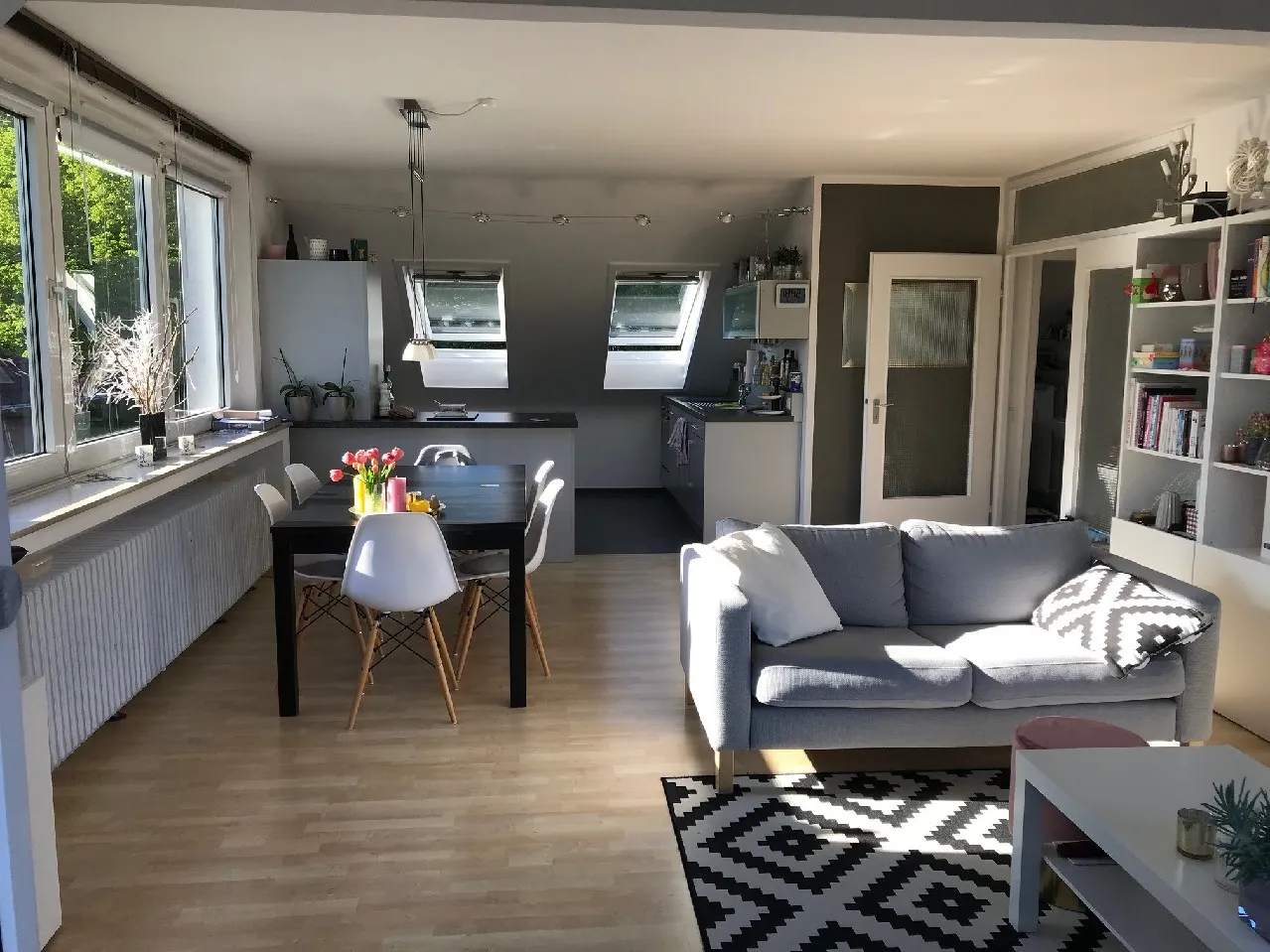 Großzügig und gemütlich ist der Wohnbereich, der von drei Seiten belichtet wird. Ausgestattet mit Parkettboden gelangen Sie von hier aus auf die nach Süden ausgerichtete Dachterrasse mit Sonnenmarkise.